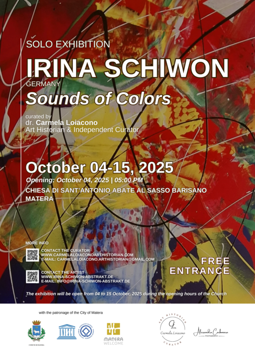 Opened from 04 to 15 October 2025, at Chiesa di Sant’Antonio Abate al Basso Barisano, located at Via Sant’Antonio Abate in Matera, the solo exhibition of the German artist Irina Schiwon has been curated by art historian Dr. Carmela Loiacono with the patronage of the City of Matera.